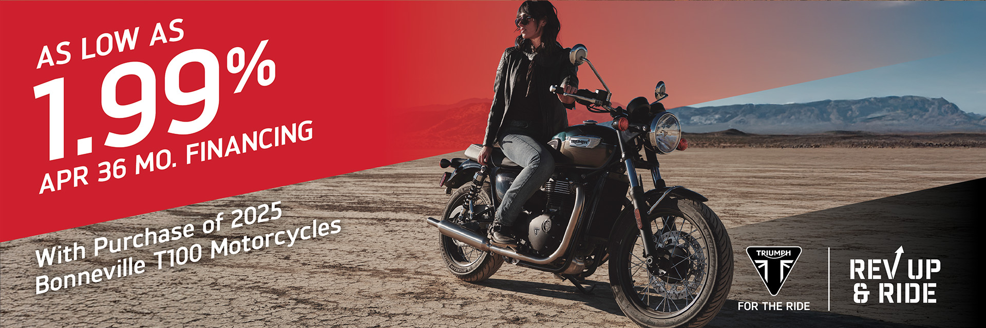 The Rev Up & Ride promotion offers robust incentives for riders to start their riding season on a new Triumph motorcycle, with cash offers and low financing rates.